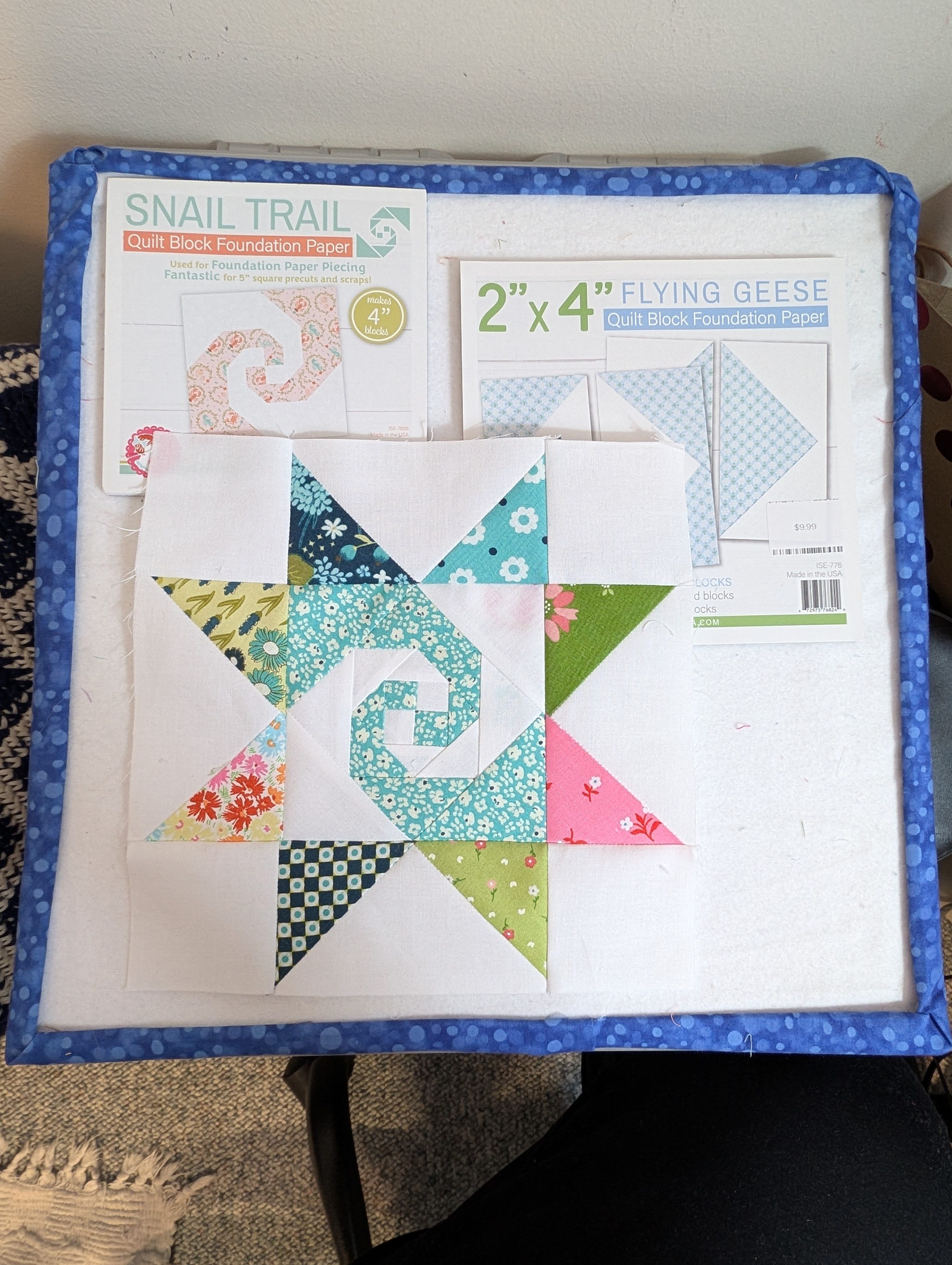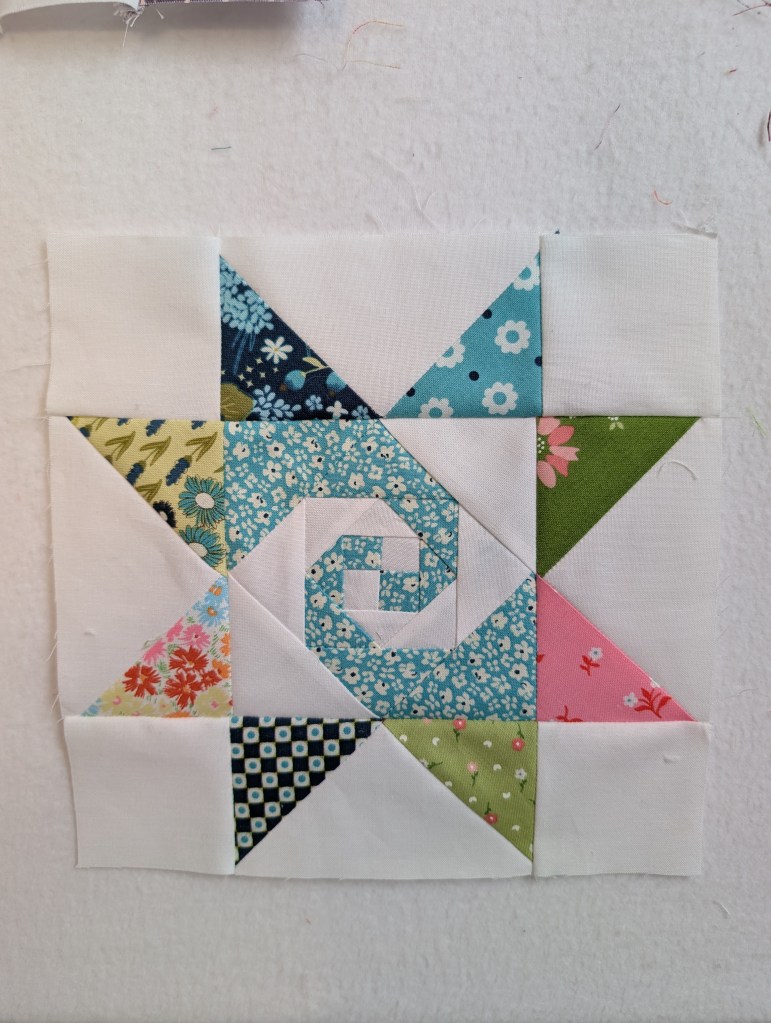 This week was a little tiny center snail trail 4 in block. You can see in the photo that I have been using foundation paper piecing pads for my blocks. I do love these pre printed pads from It’s so Emma. The paper is thin and easy to tear off once you are finished . In addition there are directions on how to sew the block.