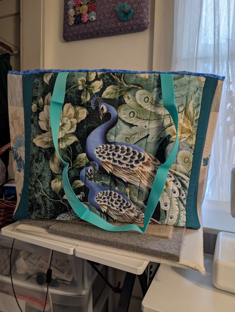 I made a tote bag this week using 2 panels. I need to topstitch around the very top to keep the lining down inside the bag. I went to quilt guild and started sewing together the panels I had prequilted prior to the meeting. We were given directions on how to assemble the panels. I didn’t have enough fabric for the lining so I finished the project at home. I have made bags before but not using soft and stable for the body. I loved using it and how the project turned out. I will take the left of soft and stable and make a sewing machine cover using similar construction techniques. Love the big bag and it can stand on it’s own!