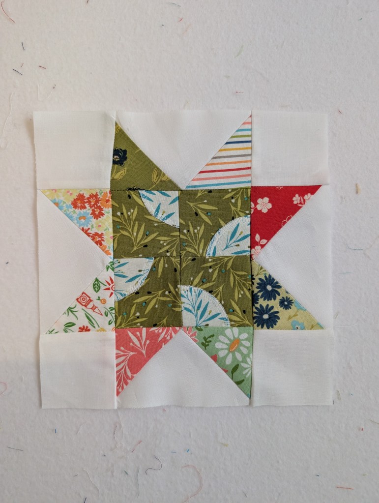 This week is the drunkards path block and I was scared!! It can be a tricky block but especially for the center 4 inch block of this week’s star!